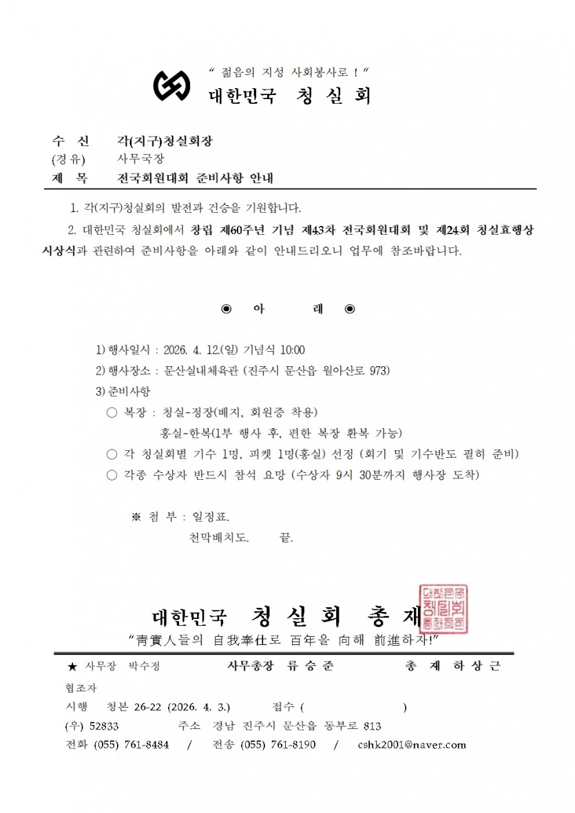 전국회원대회 준비사항 안내 페이지 정보 작성자대한민국청실회 작성일26-04-03 15:20 조회10회 본문 . 첨부파일 22-전국회원대회 준비사항 안내.pdf (110.3K) 0회 다운로드 | DATE : 2026-04-03 15:20:43 목록 다음글회의결과 통보 (2/4분기 정기이사회) 댓글목록 댓글목록 등록된 댓글이 없습니다.