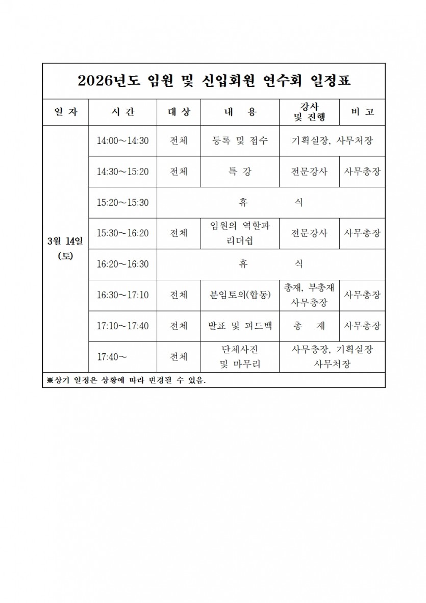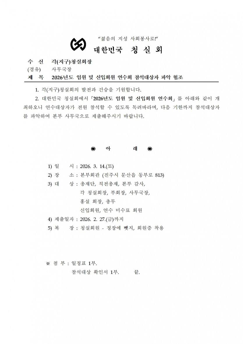 2026년도 임원 및 신입회원 연수회 참석대상자 파악 협조